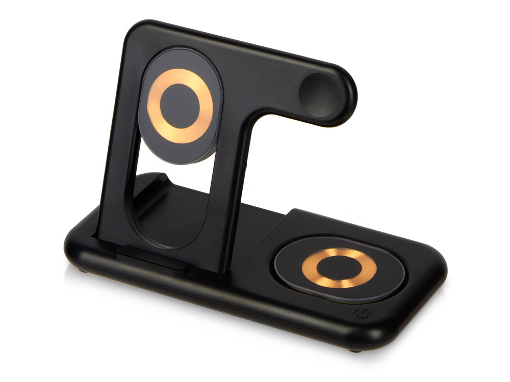Беспроводная зарядная станция на 3 устройства MajestiQ с прогрессивным дизайном: модуль беспроводной зарядки в вертикальном сегменте станции может менять свое положение по принципу слайдера. Это позволяет настроить положение под размер любого смартфон, не снимая чехла. На станции можно заряжать три беспроводных устройства одновременно: смарт-часы Apple, смартфон и беспроводные наушники. Вместо наушников можно расположить для зарядки второй смартфон. MajestiQ поддерживает быструю беспроводную зарядку 15 Вт. * В зарядные модули встроена атмосферная подсветка с тремя уровнями яркости. Поставляется в сложенном виде, угол наклона можно выставить практически любой. • настраиваемая высота вертикального модуля зарядки • быстрая беспроводная зарядка до 15 Вт • 3 яркости подсветки зарядных мест • регулируемый угол наклона станции * при наличии сетевого адаптера 18 Вт и выше (в комплект не входит).