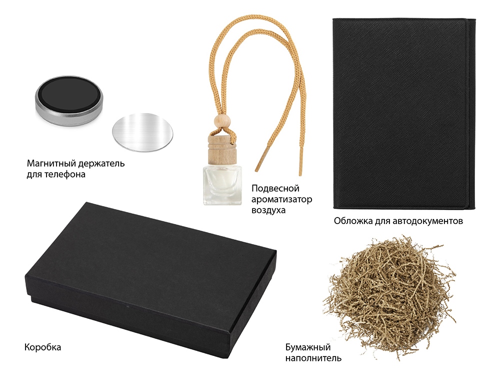 Магнитный держатель состоит из двух частей: пластикового дискообразного держателя и самоклеящейся стальной пластины. Можно использовать с любой гладкой поверхностью, к которой его можно прикрепить. Держатель снабжен клеевым слоем с обратной стороны и прорезиненным покрытием с лицевой, что помогает сохранять поверхность прикрепляемых предметов целой, без царапин. Обложка для документов поможет держать все необходимые документы под рукой и надёжно защитить их. Обложка имеет 7 отделений и вмещает в себя: водительское удостоверение, СТС, страховой полис, пластиковые карты, купюры. Бамбуковая крышка ароматизатора отлично впитывает и долго держит аромат. Благодаря привлекательному внешнему виду диффузор станет отличным украшением салона автомобиля, комнаты или офиса. Для усиления эффекта необходимо перевернуть емкость на 1-2 секунды. - флакона ароматизатора хватает в среднем на 2 месяца; - обложка для документов закрывается на магнит; - подарочная коробка с наполнителем уже включена в набор.
