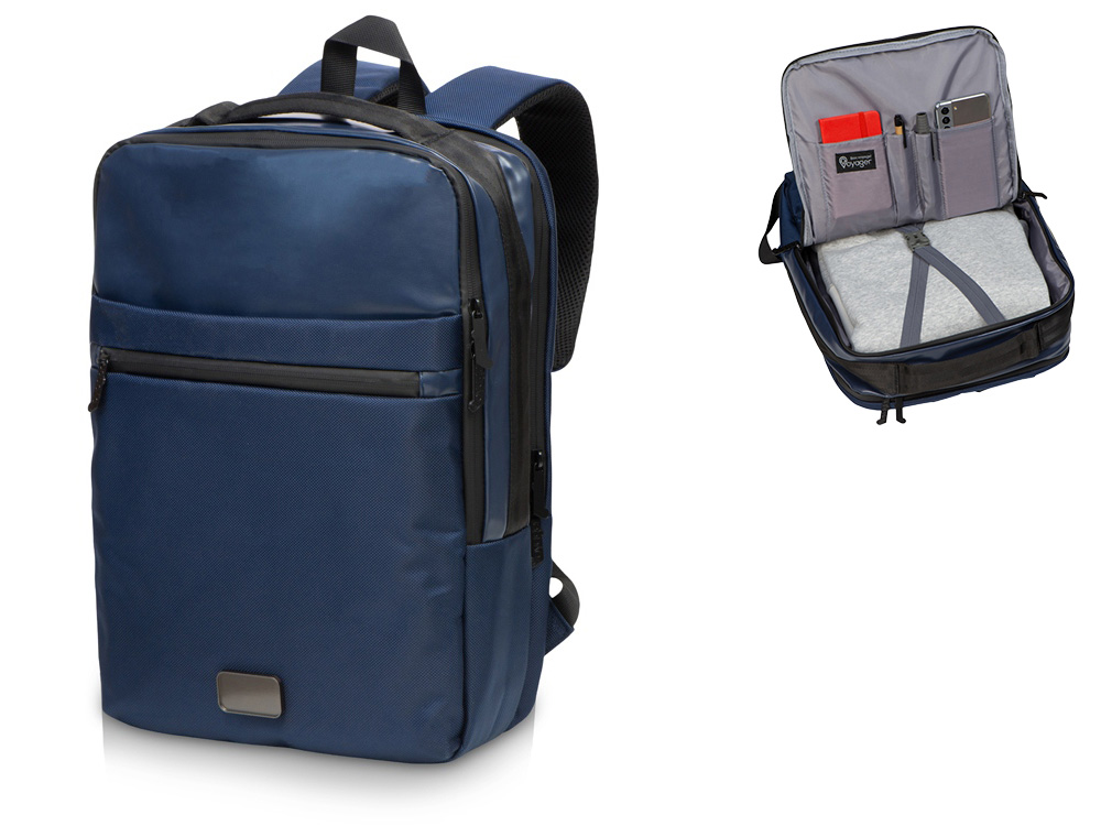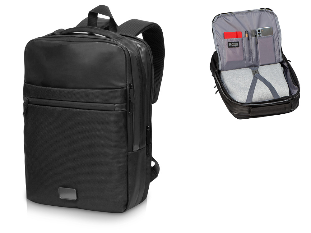 Удобный бизнес-рюкзак для передвижения по городу и деловых поездок состоит из отделения для ноутбука и планшета, большого отделения для одежды с фиксирующими ремнями, 2х наружных карманов на молнии спереди. Конструкция рюкзака продумана до мелочей: внутри большого отделения расположен органайзер для гаджетов и проводов, на спинке есть ремень для крепления на ручку чемодана и регулирующиеся по длине лямки, на лямке - карман для карт или ключей. Водостойкий материал и молнии. В комплекте мешок из спанбонда для хранения и металлический шильд под ваш логотип.