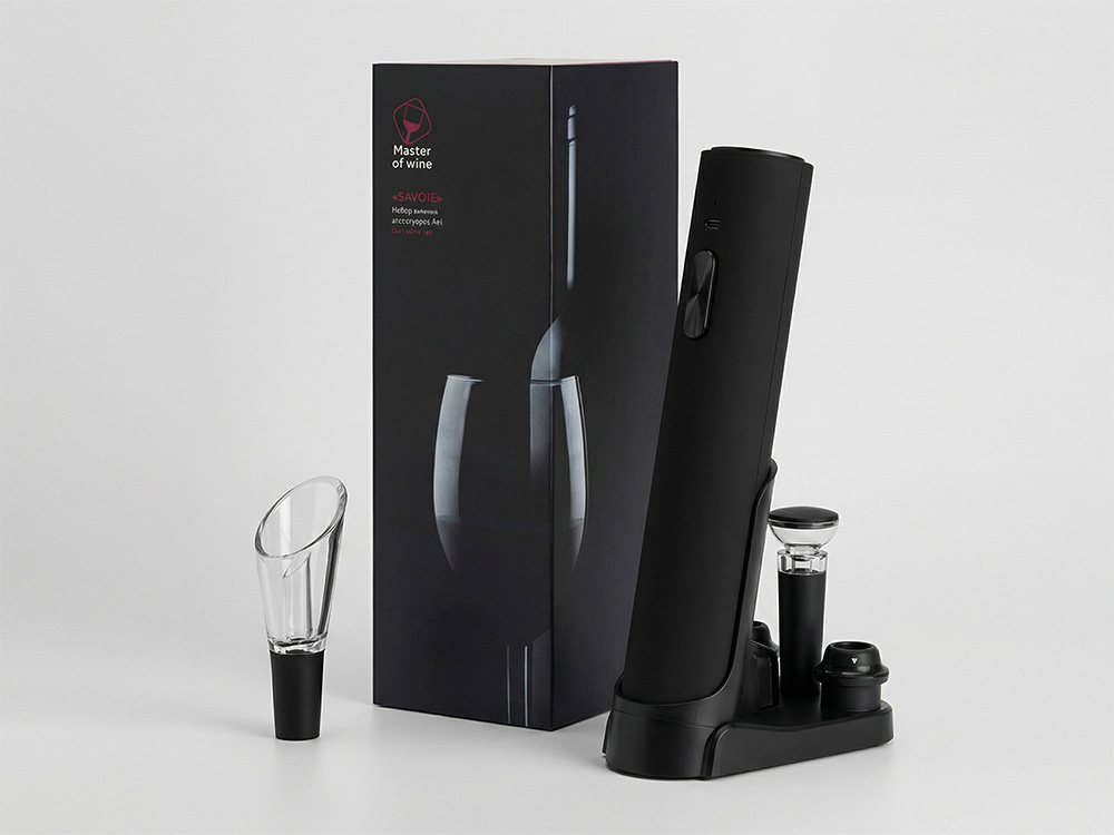 Комплектность: электрический штопор-вакуумный насос, нож для срезания фольги, аэратор, вакуумные пробки, зарядная станция, кабель USB-C