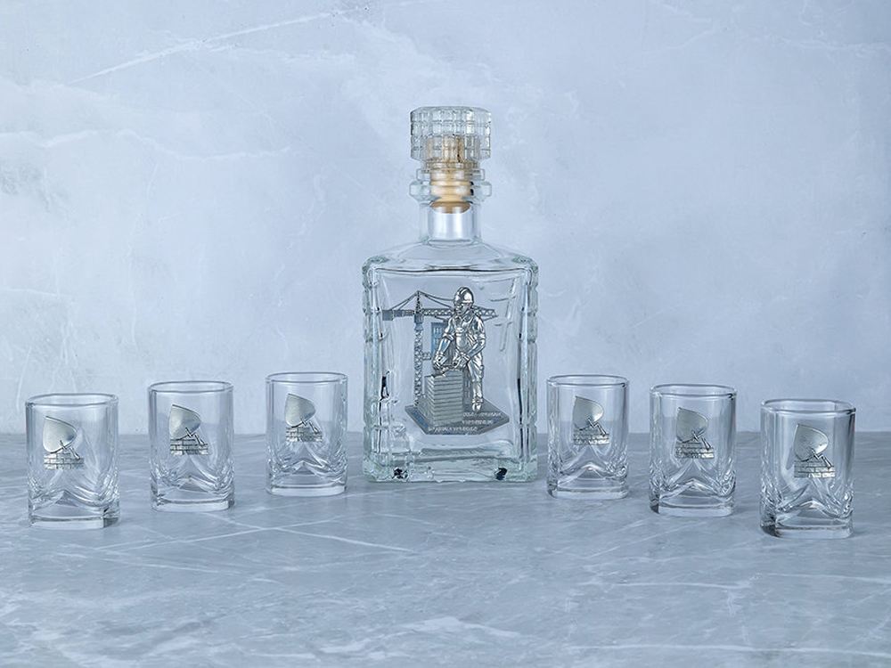 Подарочный набор со штофом «СТРОИТЕЛЬ». Традиционная для русского человека комплектация: элегантный графин емкостью 700 мл. с оловянным барельефом «СТРОИТЕЛЬ» и 6 стопок емкостью 50 мл. с оловянным барельефом «Мастерок». Материал барельефов: сплав с содержанием олова не менее 95%(пьютер). Художественное литье,чернение с эффектом антикварного серебра,полировка. Ручная работа. Подарочная упаковка «люкс» с атласным ложементом синего цвета.