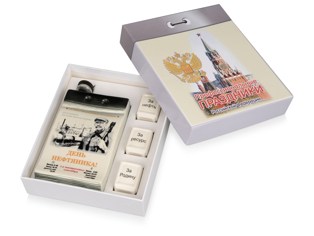 Стильный набор из штофа и рюмок стилизованный под профессиональный календарь станет креативным подарком к профессиональному празднику. Штоф и рюмки изготовлены из высококачественного фарфора. На каждой рюмке написано оригинальное послание-тост. Упакован подарок в коробку стилизованную под календарь. Идеальный и оригинальный подарок, чтобы поздравить сотрудника или руководителя с профессиональным праздником.