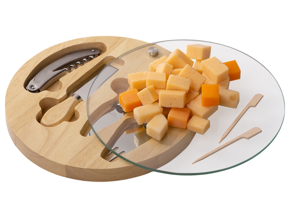 Набор "Rendezvous" - отличный подарок для тех, кто любит приятно провести вечер за бокальчиком любимого вина и вкусных закусок. Набор включает включает в себя 3 вида ножей для разных сортов сыра и винный штопор. Все предметы выполнены из высококачественных материалов. Поставляется в стильной деревянной коробке со стеклянной крышкой, на которой выигрышно будет смотреться любой корпоративный слоган или логотип компании, а полноцветная УФ печать в край крышки обязательно создаст ВАУ эффект! Набор включает в себя: - листовидный нож для твердых сортов сыра, - нож-лопатка для мягких сортов сыра, - вилка для сыра, - штопор для вина - разделочная стеклянная доска с поворотным механизмом (крышка). Внимание, крышка от набора поставляется в разобранном виде, для удобства нанесения на ней. При условии заказа с нанесением, набор поставляется в собранном виде (крышку закрепляют шурупами). Бесплатно осуществляется нанесение только на одном предмете.
