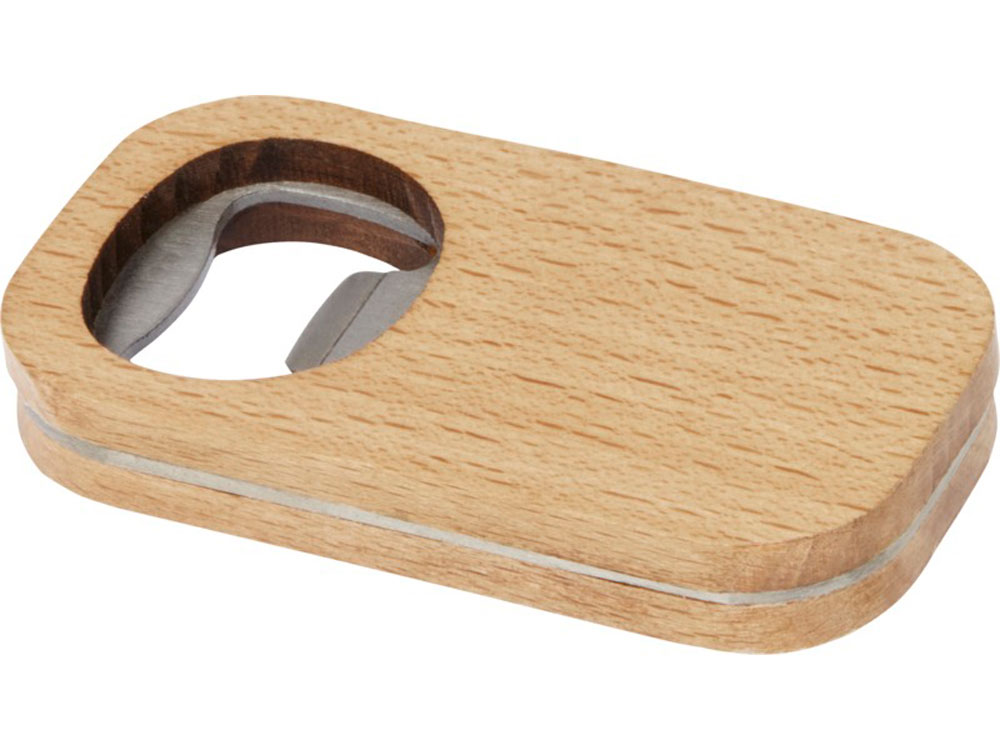 Открывалка для бутылок из нержавеющей стали с деревянной поверхностью. Дерево, нержавеющая сталь.