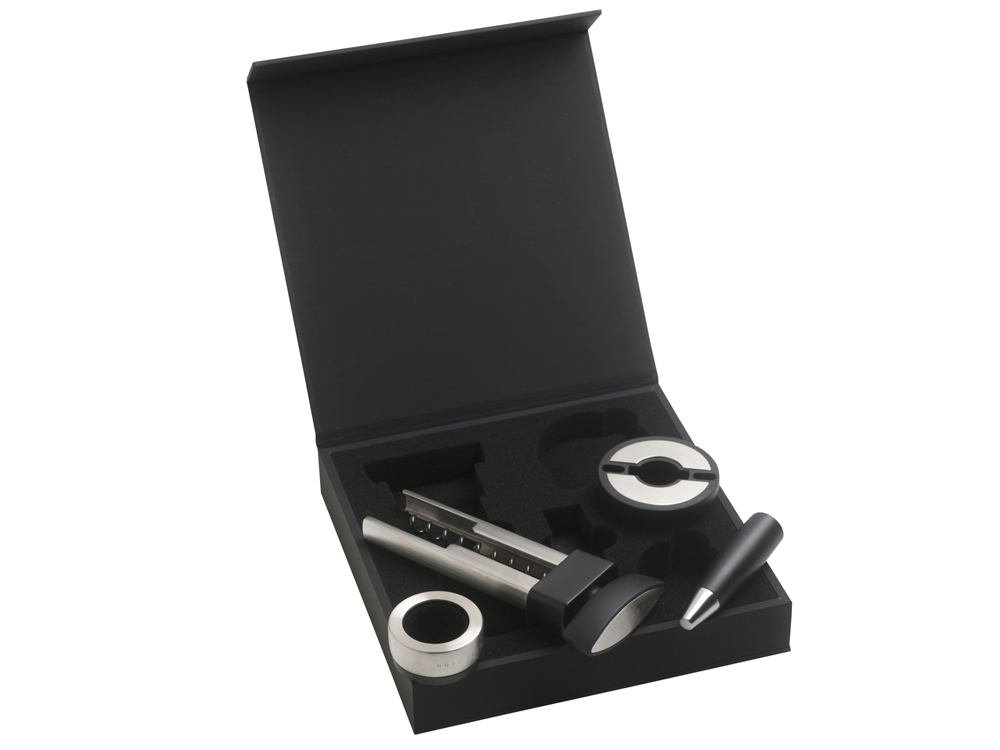 Набор для вина от Hugo Boss состоит из каплеуловителя, штопора, пробки для бутылки и ножа для фольги. Все элементы набора выполнены в стальном с черными вставками цвете и имеют вставки из силиконовой резины. Матовая текстура черных вставок кажется еще более бархатистой, оттеняемая серебристой нержавеющей сталью, из которой выполнены металлические детали элементов набора. Каждое приспособление для вина имеет логотип Hugo Boss: на пробке и ноже для фольги лого нанесено на черные вставки, а у штопора и каплеуловителя маркированы металлические детали. Набор поставляется в фирменной подарочной черной коробке на магнитном клапане и с ложементом, на котором под каждое приспособление вырублена ниша. Сертификат подлинности приложен к каждому комплекту.