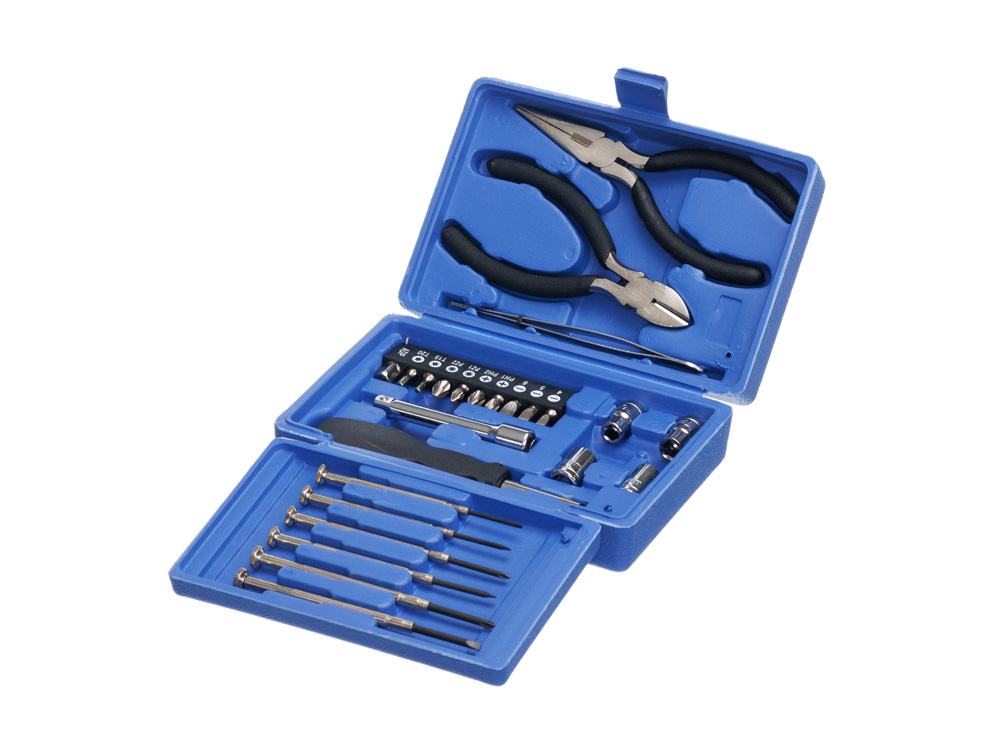 НАБОР ИНСТРУМЕНТОВ STINGER, 25 ПРЕДМЕТОВ Набор инструментов на 25 предметов STINGER W0414 поставляется в необычном трёхстворчатом пластиковом кейсе насыщенного синего цвета. Входящие в комплект инструменты позволят без труда решать самые разные задачи по ремонту в доме или починке техники. Все инструменты изготовлены из высококачественной закаленной углеродистой стали с хромированным покрытием, рукоятки выполнены из углепластика чёрного цвета. Этот материал не скользит и гарантирует удобное положение в руке. В КОМПЛЕКТЕ: 1. Рукоятка для бит - 1 шт. 2. Бита - 9 шт. 3. Адаптер для шестигранных головок – 1 шт. 4. Удлинитель для шестигранных головок – 1 шт. 5. Головка шестигранная (6/7/8/9 мм) – 4 шт. 6. Отвёртка прецизионная шлицевая – 4 шт. 7. Отвёртка прецизионная крестовая – 2 шт. 8. Плоскогубцы – 1 шт. 9. Кусачки – 1 шт. 10. Пинцет – 1 шт. ХАРАКТЕРИСТИКИ: Материал: углеродистая сталь, углепластик (карбон) Размер: 164 х 107 х 49 мм