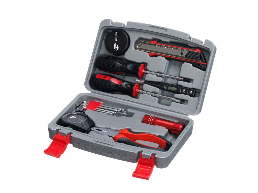 НАБОР ИНСТРУМЕНТОВ STINGER, 13 ПРЕДМЕТОВ С набором инструментов STINGER NST128014 на 13 предметов можно быстро и эффективно решить любую хозяйственную задачу. Этот набор идеально подойдёт для осуществления мелкого ремонта по дому, починки бытовой техники, сборки мебели и выполнения множества других задач. Все инструменты упакованы в пластиковый кейс серого цвета с надёжными фиксаторами. Рабочие части каждого изделия выполнены из высококачественной закаленной углеродистой стали с хромированным покрытием, а рукоять - из мягкого нетоксичного пластика. В КОМПЛЕКТЕ: 1. Нож канцелярский - 1 шт. 2. Отвёртка шлицевая - 1 шт. 3. Отвёртка крестовая – 1 шт. 4. Рулетка измерительная (3 м) – 1 шт. 5. Отвёртка индикаторная – 1 шт. 6. Пассатижи – 1 шт. 7. Ключ шестигранный – 5 шт. 8. Фонарик – 1 шт. 9. Лента изоляционная – 1 шт. ХАРАКТЕРИСТИКИ: Материал: углеродистая сталь, пластик, полипропилен, термопласт Размер: 245 х 160 х 55 мм
