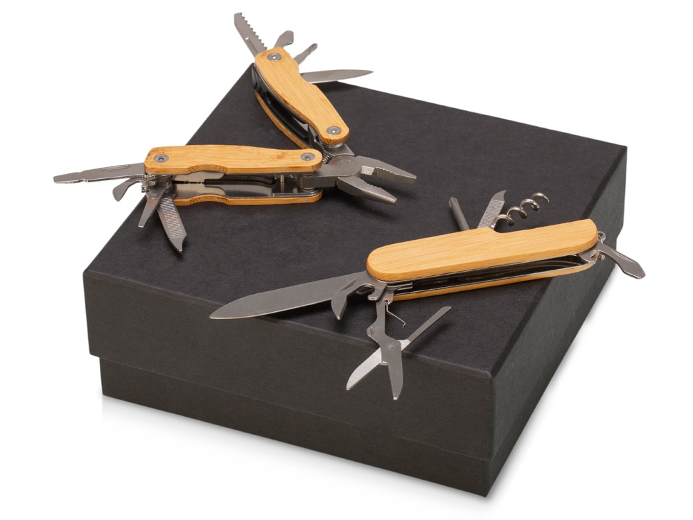 Набор состоит из двух предметов: Мультитул-нож для повседневных нужд (состоит из открывалок для банок и бутылок, плоской отвертки, пилки, штопора, ножа и ножниц); Мультитул-плоскогубцы для ремонта (состоит из плоскогубцев, открывалок для бутылок и банок, крестовой и 3-х плоских отверток, ножа, пилы по дереву и напильников по дереву и металлу). Оба мультиинструмента сочетают в себе текстуры металла и теплого натурального бамбука, благодаря чему хорошо ложатся в руку. • легкие и компактные мультитулы на все случаи жизни • мультитул-нож для повседневного ношения, мультитул-плоскогубцы для бытовых дел • качественные и долговечные материалы • подарочная коробка