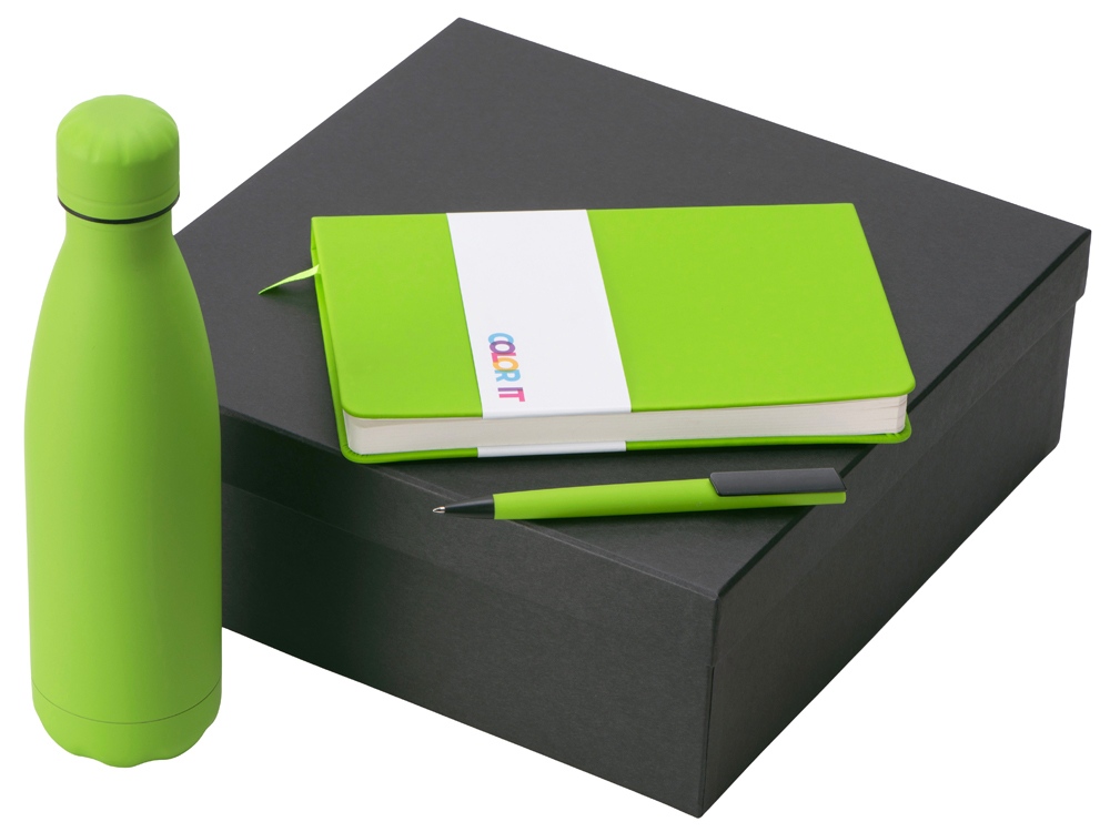 Color It — линейка, в которую входят хиты мерча в десяти самых популярных цветах. Еще никогда собрать сет под свой брендбук не было так просто. Широкая цветовая палитра серии позволяет создать идеальный набор в едином оттенке Pantone. Все товары имеют тактильно приятное покрытие софт-тач. Сет поставляется в коробке: мы продумали все, включая подарочную упаковку, за вас — осталось нанести лого! Классическая форма термобутылки сочетается с продуманной и технологичной конструкцией: вакуумная теплоизоляция и двойные стенки бутылки обеспечивают качественное сохранение температуры напитка до 24-х часов! Блокнот имеет гибкую обложку и 256 страниц в линейку, даты не указаны, что позволяет начать вести блокнот в любой удобный день года. Ляссе, срез блока и форзац окрашены в тон обложки. Тонкое письмо ручки обеспечивается пишущим узлом с толщиной письма 0,5 мм с нажимным механизмом. - бумага соответствует стандартам FSC; - софт-тач покрытие на всех предметах набора; - объём бутылки: 500 мл; - подарочная упаковка с дизайнерской бумагой уже включена в набор.