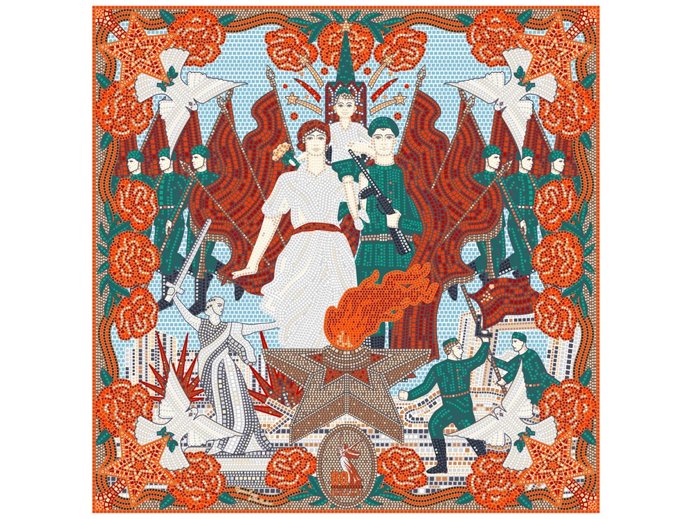 Платок «80 лет Великой Победы» посвящён юбилею всенародного свершения, изменившего ход мировой истории. Дизайн выполнен в стилистике советского реализма в мозаичной технике, где изображения иллюстрируют преемственность поколений и гордость Великим подвигом. В центре полотна запечатлен парад на Красной площади по случаю торжества 9 мая, самого почитаемого дня нашей страны. Главенство в колорите принадлежит цветам российского флага. Белый и голубой означают мир, духовность и постоянство. Активные красные акценты – знамена, пламя, гвоздики, георгиевские ленты, Спасская башня – воплощают силу русской державы, код национальной идентичности. Образы советских солдат и монументов, отражающие исторические реалии, заключают общую идею – триумф народа-освободителя и Великой Победы! Художники: Нина Ручкина, Валерия Разумова.