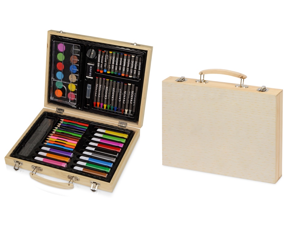 Набор из 67 предметов для рисования. Набор включает 12 акварельных красок, 12 цветных карандашей, 12 масляных пастелей, 12 фломастеров, 12 мелков, клей, резинку, точилку, карандаш HB, линейку и кисточку. Набор упакован в деревянный чемоданчик.