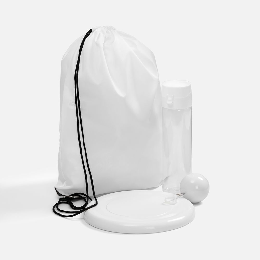 бутылка, футляр, тарелка-фрисби - пластик; плащ - полиэтилен, ПНД, плотность 12 мкм; рюкзак-мешок - спанбонд, плотность 70 г/м²