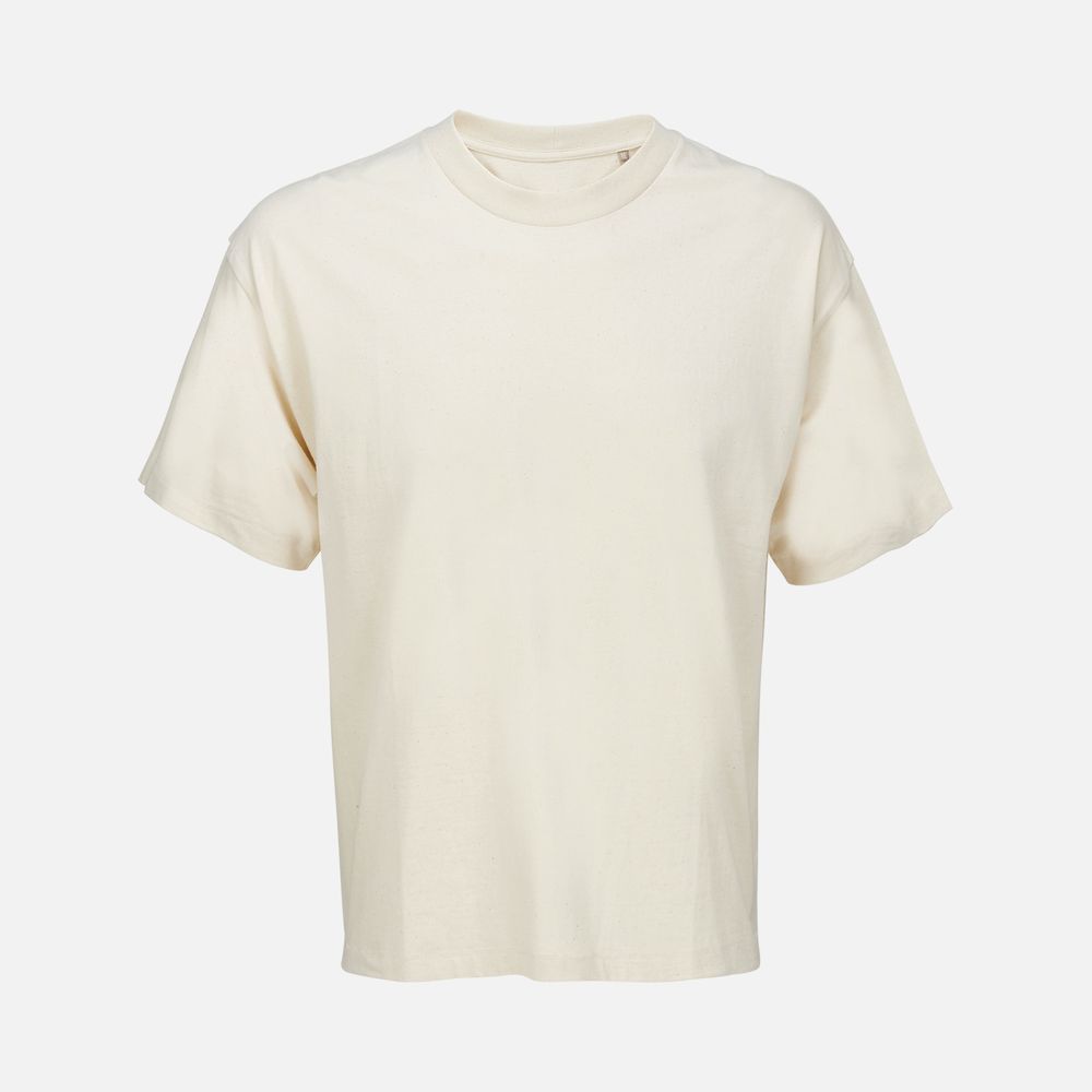 Футболка оверсайз унисекс с круглым вырезом и без боковых швов. Выполнена из смеси переработанного и обычного хлопка. Благодаря повышенной плотности отлично держит форму.