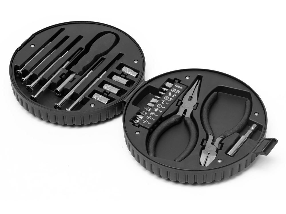 Комплектность: плоскогубцы- 2 шт, биты- 9 шт, адаптер для торцевых ключей- 1 шт, торцевые ключи- 5 шт, универсальная отвертка- 1 шт, часовые отвертки- 6 шт