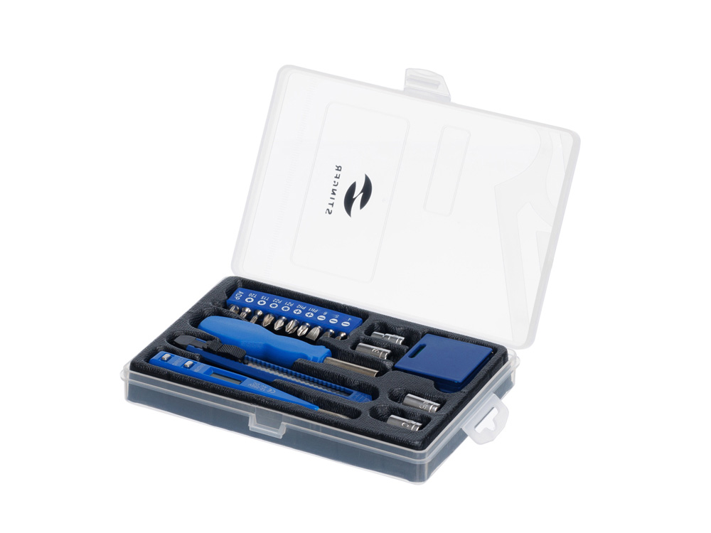 НАБОР ИНСТРУМЕНТОВ STINGER, 18 ПРЕДМЕТОВ Набор инструментов на 18 предметов STINGER W0504 представляет собой оптимальное сочетание функциональности и качества. В компактном белом кейсе найдется всё для проведения мелкого бытового ремонта. Все предметы изготовлены из высококачественной закаленной углеродистой стали с хромированным покрытием, а рукоятки - из углепластика, обеспечивающего удобное положение инструмента в руке. В КОМПЛЕКТЕ: 1. Рукоятка для бит - 1 шт. 2. Бита - 9 шт. 3. Адаптер для шестигранных головок – 1 шт. 4. Головка шестигранная – 4 шт. (7/8/9/10 мм) 5. Рулетка измерительная (1 м) с уровнем – 1 шт. 6. Нож канцелярский - 1 шт. 7. Отвёртка индикаторная – 1 шт. ХАРАКТЕРИСТИКИ: Материал: углеродистая сталь, углепластик (карбон) Размер: 215 х 130 х 30 мм
