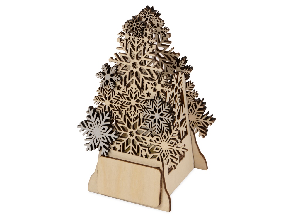 Фонарик с электрической свечой в виде резной елочки с декоративными снежинками серебристого цвета. Батарейка в комплекте. Для удобства нанесения Вашего логотипа, елочка поставляется в комплекте с деревянным шильдом, на котором можно сделать гравировку и другие виды дизайна.