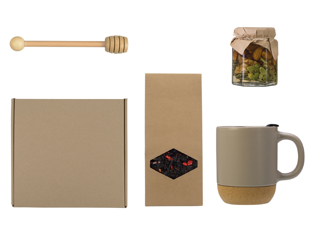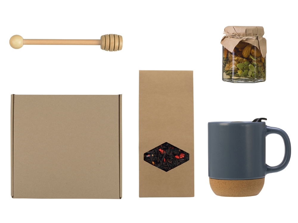 Набор станет приятным и неожиданным подарком для ценителей чаепитий и сладостей. Керамическая кружка оснащена пробковым дном, которое позволяет ставить ее на стол мягко, без скольжения и без стука, а также крышкой, которая позволит вашим напиткам дольше оставаться горячими. Купаж классического индийского чая, дополненный фруктами, ягодами и кондитерскими добавками обладает мощным согревающим и тонизирующим эффектом. Этот чай отлично сопровождает различные десерты. Натуральный мёд с грецкими орехами, миндалём, кешью и тыквенными семечками станет отличным дополнением к любому чаепитию. Витамины и микроэлементы, в избытке содержащиеся в орехах и семечках, помогут поддержать иммунитет и укрепить организм. Специально для меда существует деревянная ложечка, из-за интересной формы она носит название «веретено». Набрать мед с помощью этой ложки довольно просто: нужно опустить ложку в баночку с медом и покрутить ею в любимом лакомстве. объём кружки: 400 мл; масса нетто: 250 мл; вкусный подарок для мужчин и женщин; подарочная коробка включена в набор. Кружку можно мыть в посудомойке, но без донышка и крышки, которые нужно снять перед мойкой. Пластиковая крышка легко моется вручную под струей воды.