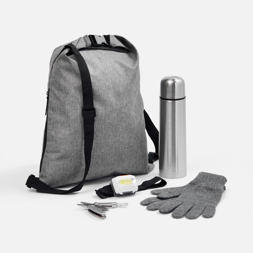 пластик, рюкзак - полиэстер, 300D, фонарь - пластик, мультитул - нержавеющая сталь, алюминий, перчатки - 50% шерсть, 50% акрил, термос - нержавеющая сталь, 304 внутри, 201 снаружи