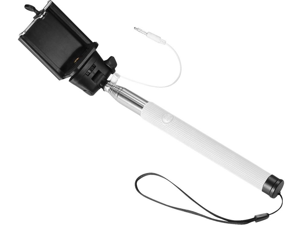 Проводной монопод. Сделайте идеальный селфи с этим выдвижным моноподом (до 90 см). Не требует батареи или использования приложения. Просто подключите 3,5 мм аудио разъем в телефон (совместим только с телефонами, у которых есть разъем 3.5 мм) и нажмите на кнопку, расположенную на ручке. Регулируемый держатель. Силикон, сталь и ПВХ.