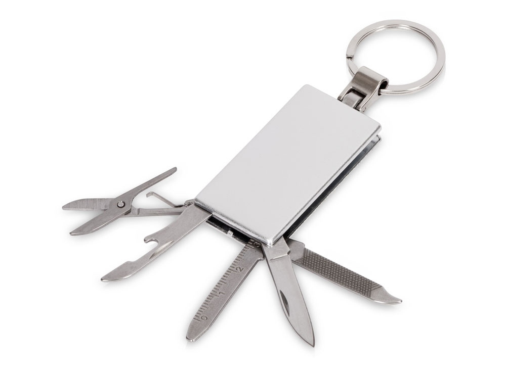 Брелок-мультитул на кольце в металлическом корпусе с заметным полем под нанесение.
