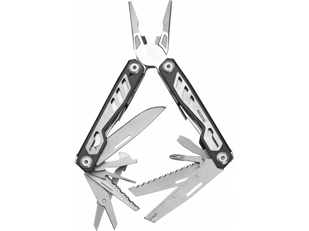 Мультифункциональный инструмент из нержавеющей стали. 16 опций: нож прямой из нержавеющей стали 3CR13 c коэффициентом твёрдости HRC57, нож серрейторный, пила, подпружиненные пассатижи, кусачки для обычной и твердой проволоки, острогубцы, плоскогубцы, напильник по дереву и металлу, стропорез, отвёртка Phillips, линейка, малая шлицевая и часовая отвертки, шило с ушком, консервный нож, открывалка для бутылок. Liner-lock. Все опции фиксируются от случайного закрытия или выпадания. 3D машинная обработка рукоятей. Покрытие частично- Black Oxide. Длина ножа 6,5 см. Длина мультитула в сложенном состоянии 9,9 см, ширина 3,6 см, толщина 2,3 см. Длина в раскрытом виде с пассатижами 14,6 см. Вес - 265 гр. Цвет серебристо-чёрный. Нейлоновый чехол на кнопке с ременным отверстием. Картонная упаковка.