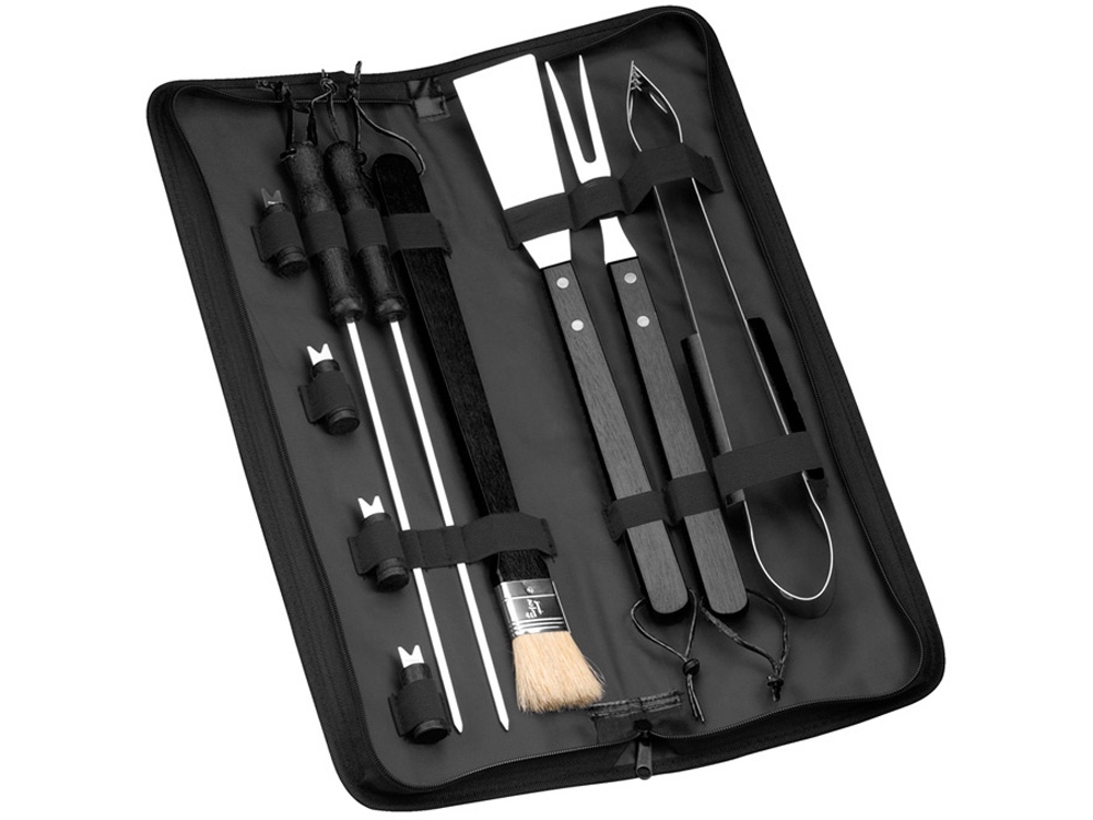 Комплектность: лопатка - 1 шт., вилка - 1 шт., щипцы - 1 шт., шампура - 2 шт., кухонная кисть - 1 шт., держатели для кукурузы - 4 шт.