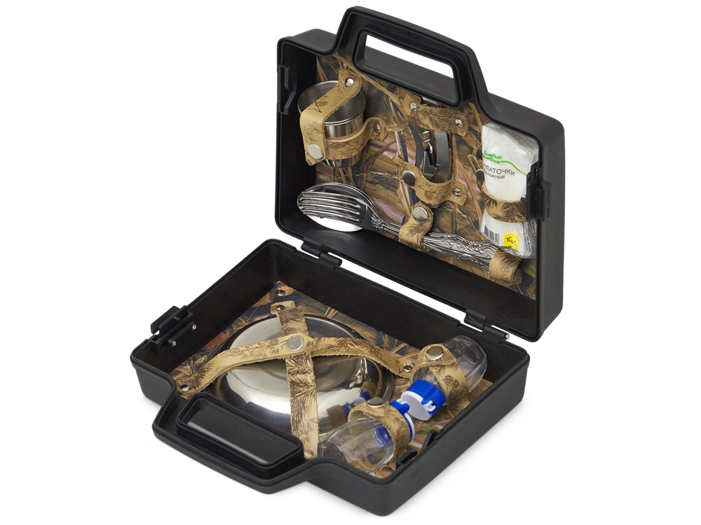 Подарочный набор для пикника. Этот тщательно подобранный комплект идеально подходит для тех, кто ценит качество и удобство во время отдыха на природе. В комплекте: - Тарелки (нерж. сталь)- 2 шт - Вилки (нерж. сталь)- 2 шт - Ложки (нерж. сталь)- 2 шт - Стопка (нерж. сталь)- 2 шт - Штопор- 1 шт - Емкости для соли и перца- 2 шт. - Платочки бумажные- 1 уп. Все аксессуары упакованы в пластиковый кейс и надежно закреплены ремешками из натуральной кожи, что обеспечивает удобство транспортировки и сохранность содержимого.