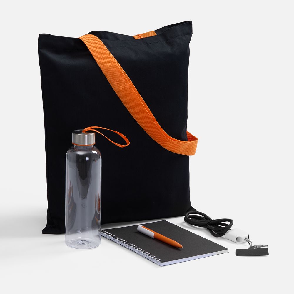 металл, ручка - пластик, сумка - хлопок, 240 г/м², ручки - полиэстер, крышка - металл, пластик, блокнот - бумага, картон, бутылка - пластик, пищевой, кабель-ланьярд - нейлон, пластик