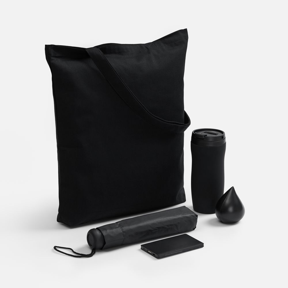зонт - полиэстер 190T, ручка - пластик; покрытие софт-тач; каркас, спицы - металл; аккумулятор - пластик; крышка термостакана, внутренняя колба - пластик, корпус - нержавеющая сталь; покрытие софт-тач; сумка - хлопок 100%, плотность 210 г/м²; антистресс -