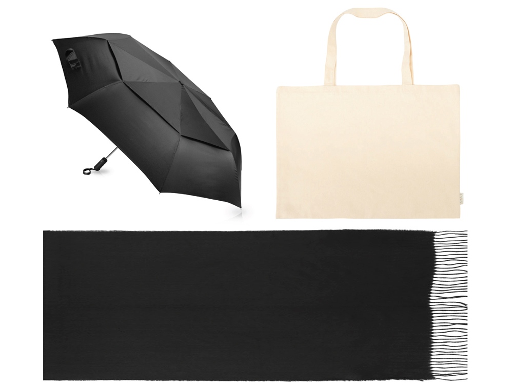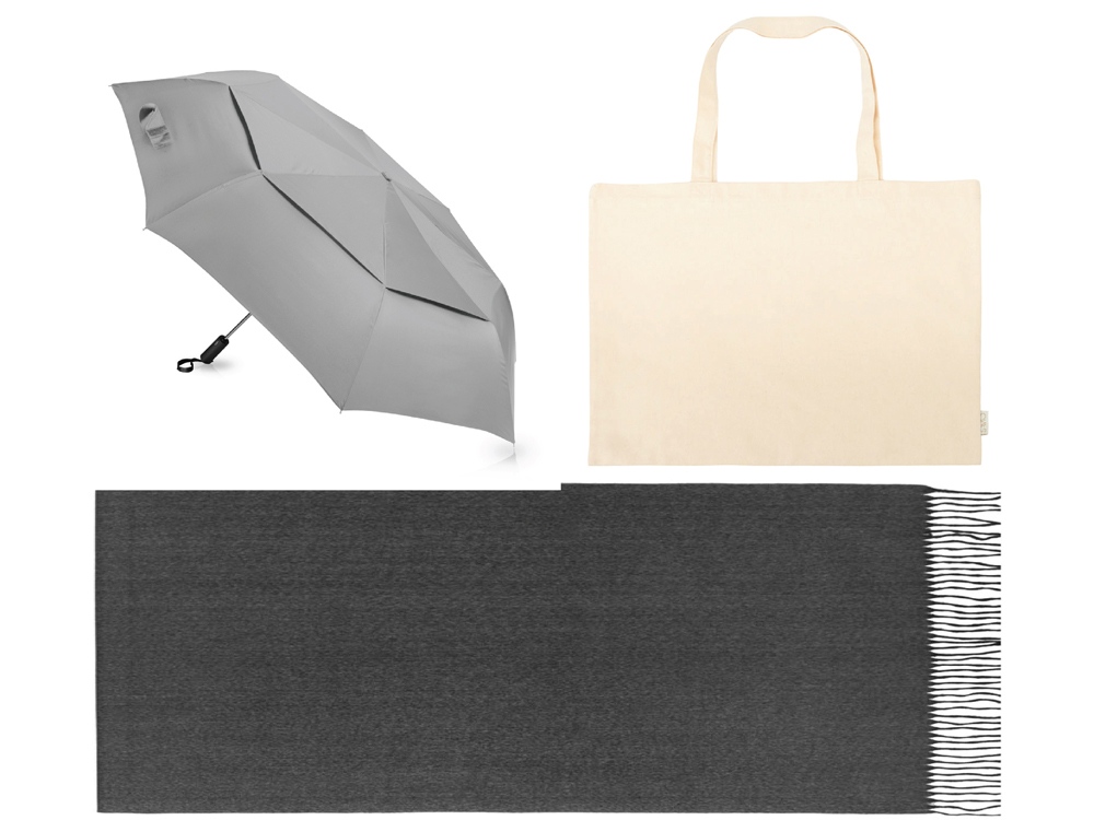Подарочный набор с зонтом и палантином Элегантный и практичный подарок, который подойдет для любой женщины. В нем сочетаются стиль, комфорт и защита от непогоды, что делает его идеальным выбором для современной леди. Прочный каркас зонта-автомата и спицы из стекловолокна выдерживают порывы ветра, благодаря чему зонт служит надежным укрытием в самый сильный дождь. Ручка обработана мягким покрытием soft-touch. Большая и вместительная сумка-шоппер модного размера oversize из переработанного хлопка пригодится в любых делах, поездках и даже для похода на пляж. Удобные широкие ручки комфортно лежат в руке. Объемный палантин из натурального хлопка имеет бахрому по краю. Открытка А6 с вашим дизайном подойдет для пожеланий или поздравлений. - диаметр купола зонта 127 см; - зонт закрывается в 3 сложения; - размер 75±3 х 200±3 см; - практичный набор для женщинам.