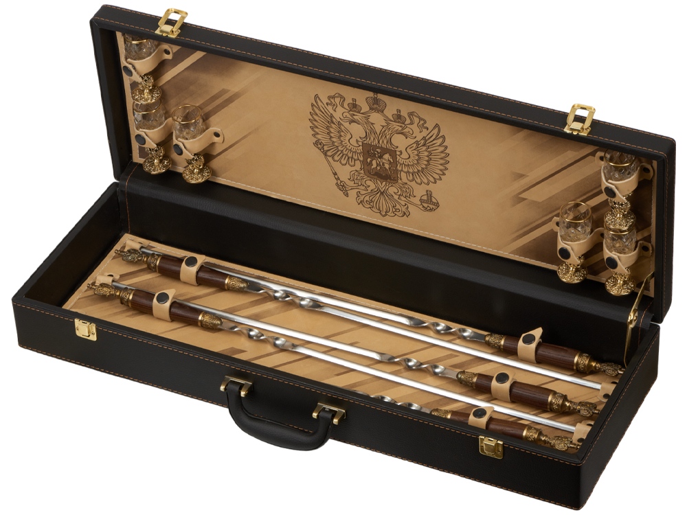 Комплектность: кейс, стопка 40мл- 4шт (d4,3 х 5,5 см), фляга- 500мл (16 х 12,7 х 4,5 см )