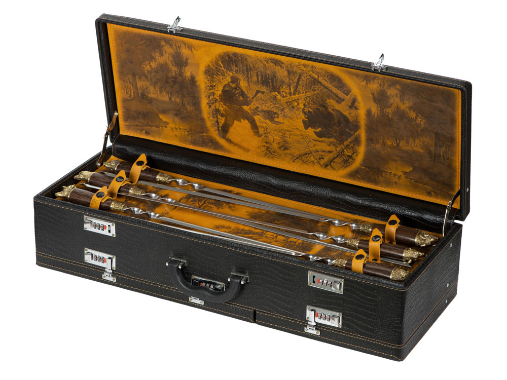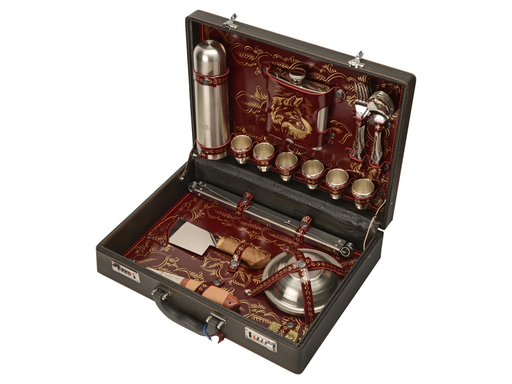 Кейс из сплит-кожи, с повышенной износостойкостью, внутренняя отделка натуральная кожа с художественным выжиганием. В комплект входит: Нож 23,5 х 3 х 2 см - 1шт Нож "Тяпка" 30 х 8,9 х 2,5 см - 1шт Тарелка d11,3 х 4,3 см - 6шт Шампур 35 х 2 х 1 см - 6шт Термос d7 х 24,5 см - 1шт Стопка - d4,5 х 5 см - 6шт Фляга 13 х 3 х 15 см - 1шт Ложка 19,5 х 4,5 х 3 см - 6шт Вилка 19 х 2,5 х 2 см - 6шт Зажигалка 3,6 х 1,3 х 6 см - 1шт