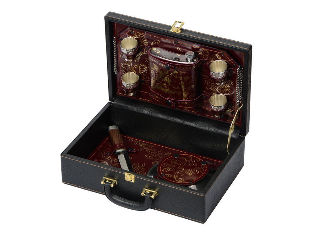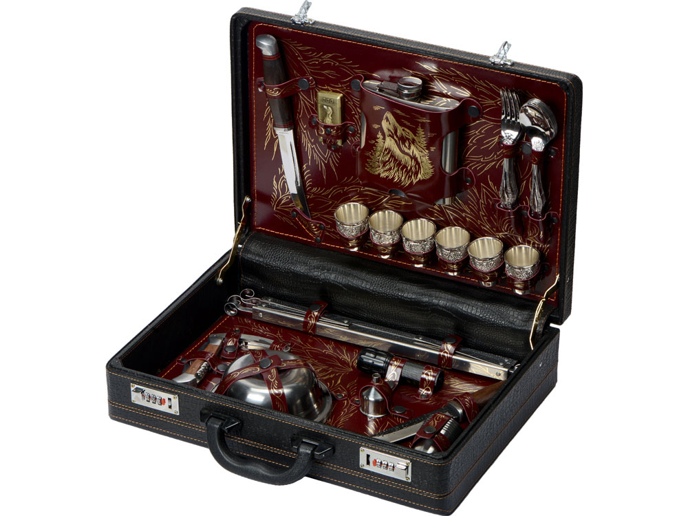 Кейс из сплит-кожи, с повышенной износостойкостью, внутренняя отделка натуральная кожа с художественным выжиганием. В комплект входит: Нож складной 13,5 х 4 х 1,6 см - 1шт Штопор 11 х 3 х 1 см - 1шт Тарелка d16 х 4 см - 6шт Воронка d4 х 4,8 - 1шт Нож "Басмач" 28 х 3 х 2,5 см -1 шт Стопка d5,2 х 6 см - 6шт Нож "Кореш" 26 х 4 х 2,5 см - 1шт Зажигалка 4 х 1,3 х 6 см - 1шт Стопка с узором d4,5 х 5 см - 6шт Фляга 13 х 3 х 15 см - 1шт Ложка 19,5 х 4,5 х 3 см - 6шт Вилка 19 х 2,5 х 2 см - 6шт Фонарик d3 х 9,5 см - 1шт