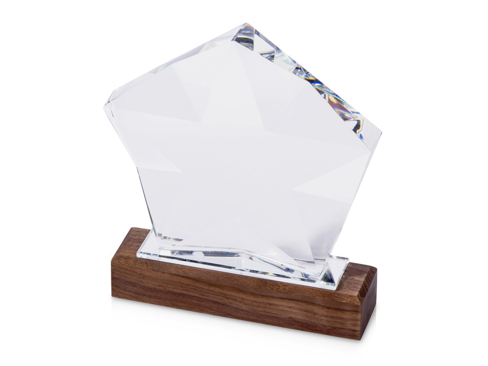 Хрустальная статуэтка с оригинальной огранкой как будто меняет форму в зависимости от угла обзора. В основании тонкий слой из цветного хрусталя, который отражаясь в гранях и создаёт иллюзию цветной подсветки.