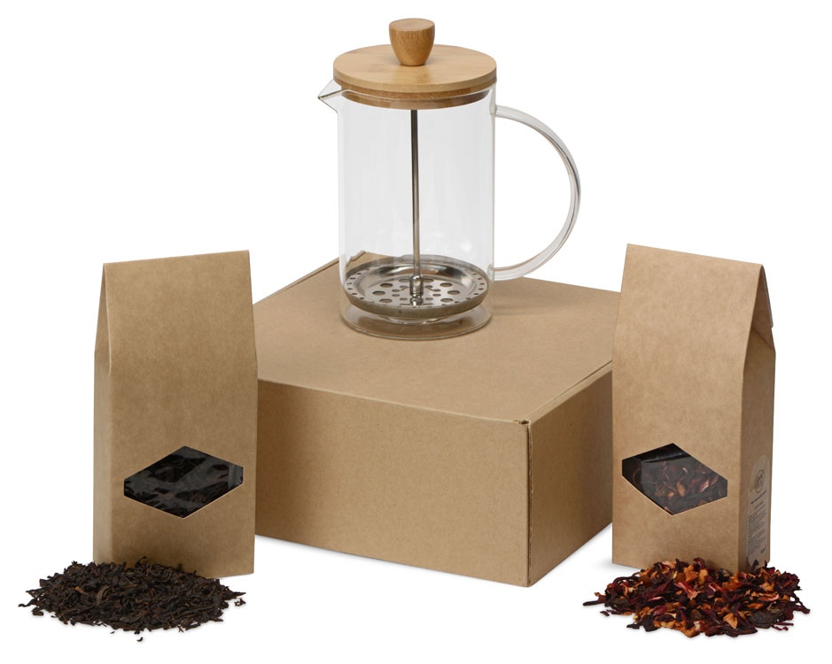 Комплектность: френч-пресс 800 мл, чай черный с бергамотом 70 мл, чай фруктовый 90 мл, бумажный наполнитель 50 г, подарочная упаковка 26,4 х 25,7 х 10,1 см