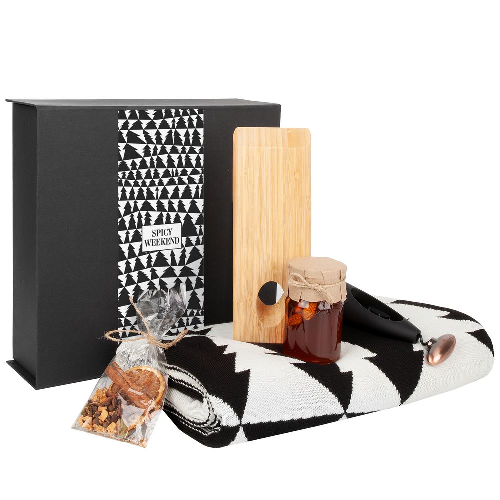 Набор Spicy Weekend создан специально для томных и непременно согревающих уикендов: в такой компании получится устроить настоящий праздник удовольствия и вкуса. Функциональные винные аксессуары подарят комфорт и добавят эстетики, а мед и традиционные специи придадут домашнему глинтвейну особенный вкус и аромат. Цветовой акцент набора — стильный монохромный плед, станет обязательным атрибутом уютного зимнего вечера.