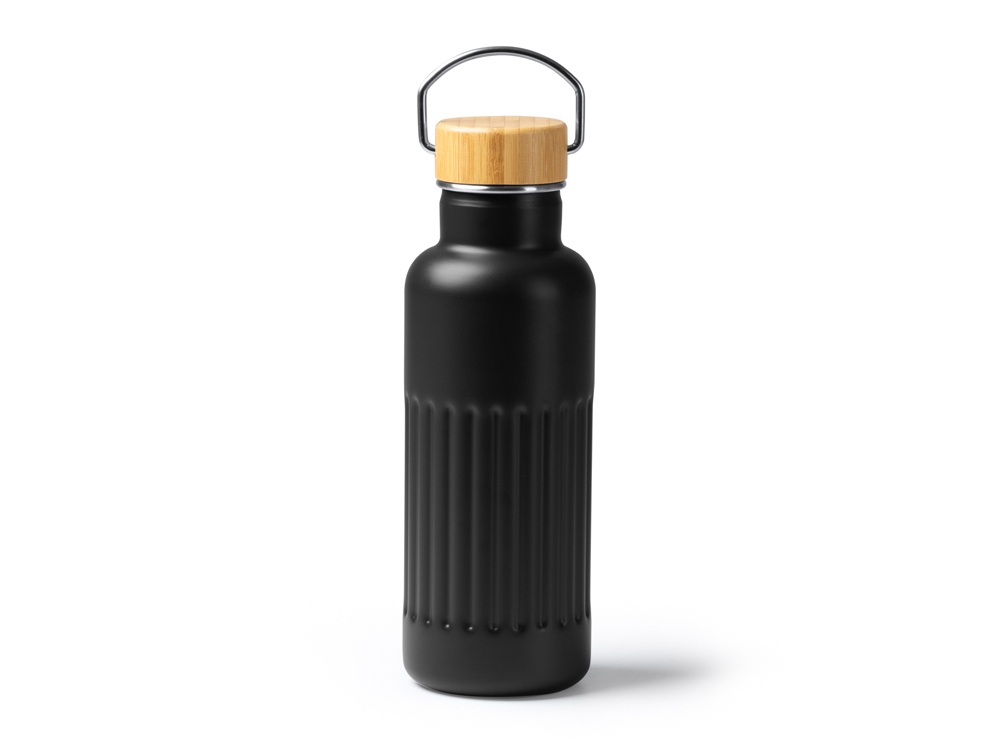 Термобутылка из переработанной нержавеющей стали 304 с двойными стенками и бамбуковой крышкой. Объём: 500 мл. Упакована в экологичную коробку.