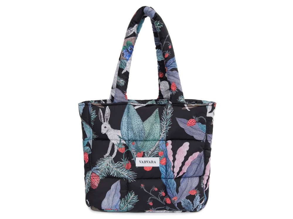 Стеганая сумка-шоппер с принтом "Зайцы" от российского бренда Varvara. Вместительный аксессуар, оптимально подходит под формат A4. Внутри имеется карман для мелочей. Авторский принт написан художницей вручную специально для российского бренда Varvara. Художница размышляла на тему русской природы, культуры и искусства - тут и лесная земляника, и сочная зелень, и конечно, сказочные зайцы - как будто только что сошли с полотен В. Васнецова. Сумка упакована в подарочную коробку. Бережный уход: - Ручная стирка при температуре не выше 30 градусов. - Сушка в горизонтальном положении. * фрагмент принта может отличаться от представленного на фото