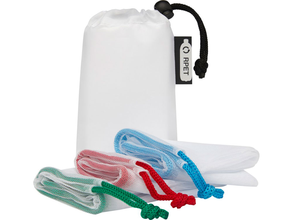 Набор из 3 сетчатых сумок из вторичного ПЭТ. Сумки многоразового использования, их можно использовать для фруктов и овощей как альтернативу пластиковым пакетам. У всех сумок есть затягивающий шнурок. Переработанный PET пластик.