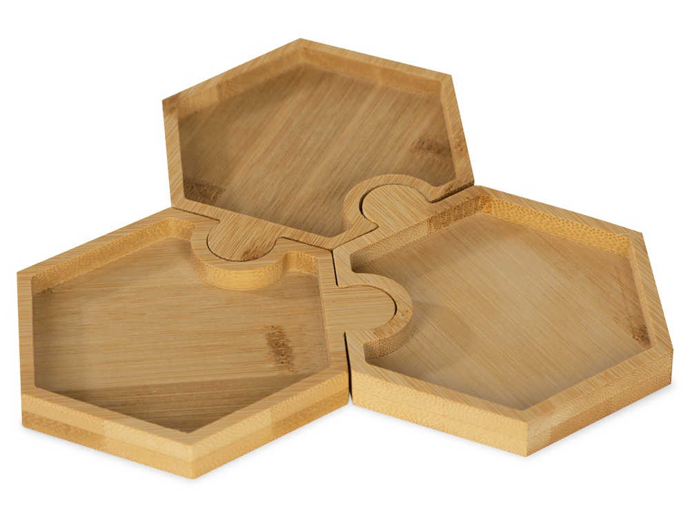 Три шестиугольных менажницы из бамбука могут использоваться как по отдельности, так и вместе, что особенно удобно при сервировке стола. Менажницы соединяются друг с другом пазами без применения каких-либо дополнительных средств. В перевернутом виде соединенные «соты» могут использоваться как подставка под горячее, что также может быть полезно не только на кухне, но и во время сервировки. - выполнены из восполняемого природного материала - можно обыграть интересным способом при помощи нанесения, например, разбив изображение или лозунг на три части - менажницы могут использоваться и для хранения непищевых продуктов, для декора интерьера, как подставка под горячее Обратите внимание на то, что менажницы не должны деформироваться — в этом случае их будет невозможно соединять в соты. Для сохранения первозданного вида набора нужно придерживаться простых правил использования: мыть вручную теплой воде с применением мягких моющих средств, не замачивать, не пересушивать, раз в несколько месяцев смазывать пищевым маслом (оливковым, растительным и т.д.)