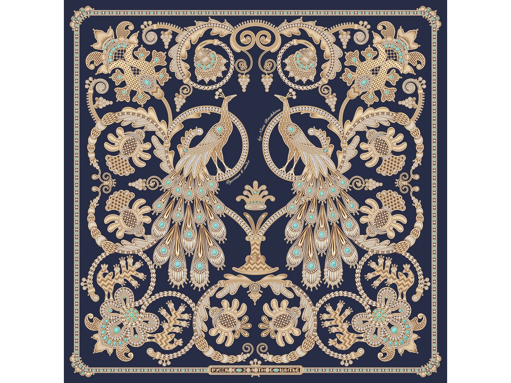Платок «Русское золотное шитьё» посвящён драгоценному старинному русскому рукоделию. Дошедшие до нас памятники шитья, выполненные русскими мастерицами, являются произведениями высокой культуры. В изделиях сочетаются талант художника и тонкий вкус, духовное богатство, исполнительское мастерство вышивальщиц. В центре композиции излюбленный сюжет традиционного русского орнамента - царственные павлины. Они горделиво восседают в обрамлении из фантастических цветов и виноградных лоз. Павлин в русской культуре — это жар-птица, которая несет в себе солнечную энергию развития, поэтому это птица семейного счастья. Они всегда рассаживаются на свадебных рушниках. Павлин за красоту своих перьев стал символом расцвета, молодости. Про стройную, красиво одетую девушку говорят: «Будто пава плывет». Мы старались воссоздать в рисунке сложную фактуру древнего промысла, придав золотошвейному искусству новую форму. Желаем всем обладательницам платка «Русское золотное шитьё» наполниться энергией и тёплом посланий предков. А изысканная цветовая гамма платка сделает этот аксессуар незаменимым в гардеробе любой леди, неравнодушной к современной моде. Дизайн: Нина Ручкина, Наталия Александрова.