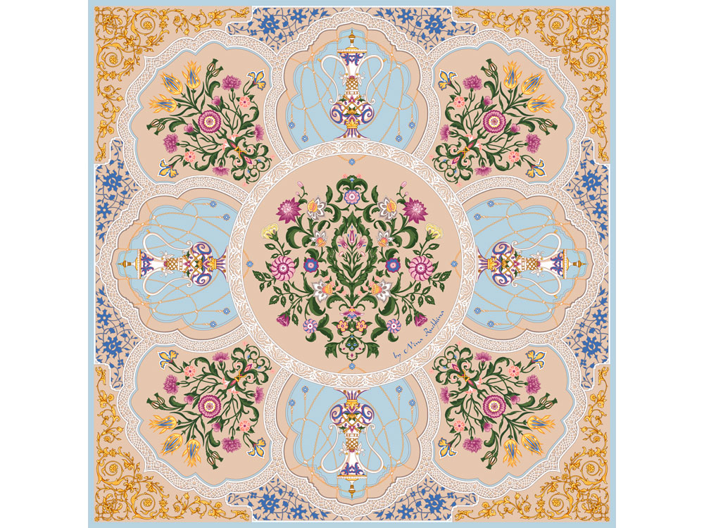 Платок “Сады Востока” от бренда “Русские в моде” by Nina Ruchkina посвящен экзотической красоте, женской привлекательности и очарованию. В центре полотна расположились цветы дивного сада, олицетворяющие собой процветание, мир и земную любовь. Рядом изображены кувшины, наполненные росой молодости и секретами вечно цветущих восточных красавиц. Принт аксессуара образуют знаменитые орнаменты востока — гирих (бесконечный “узел”) и ислими (“путь в божественный сад”). Непрерывные витиеватые линии в сочетании с узорами из гибких стеблей с зеленой листвой и пестрыми соцветиями завораживают, погружают в состояние медитации, постижения тайны мироздания через призму счастья и красоты. Облачившись в нежный шелковый платок с цветочным принтом от Нины Ручкиной, любая женщина может привнести в свой образ магию Востока, пленить и искусно укрощать мужские сердца. Дизайн: Нина Ручкина, Анна Шулик, Лола и Диана Закировы.